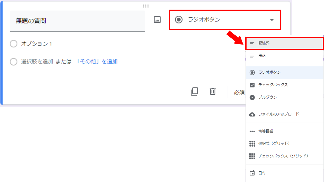 8.「ラジオボタン▼」をクリックし、「記述式」を選択し、入力(解答)方法を変更する。