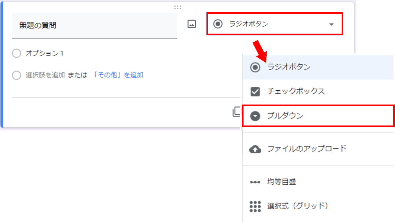 16.「ラジオボタン」をクリックし、「プルダウン」を選択し、