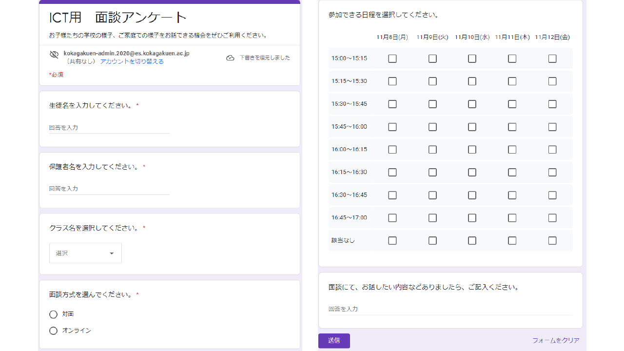 フォームの説明:お子様の学校での様子、ご家庭での様子をお話しできる機会をぜひご利用ください。