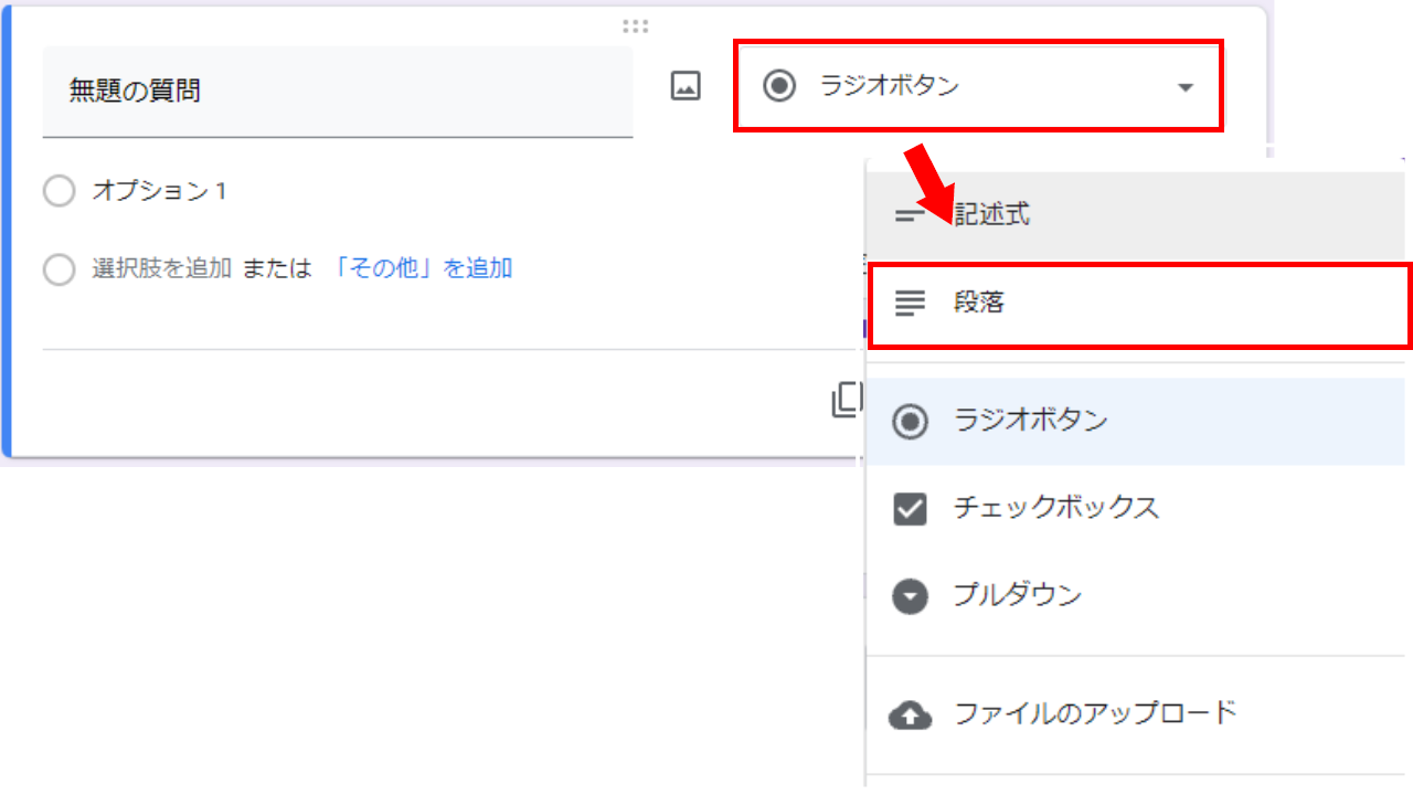 8.「ラジオボタン▼」をクリックし、「記述式」を選択し、入力(解答)方法を変更する。